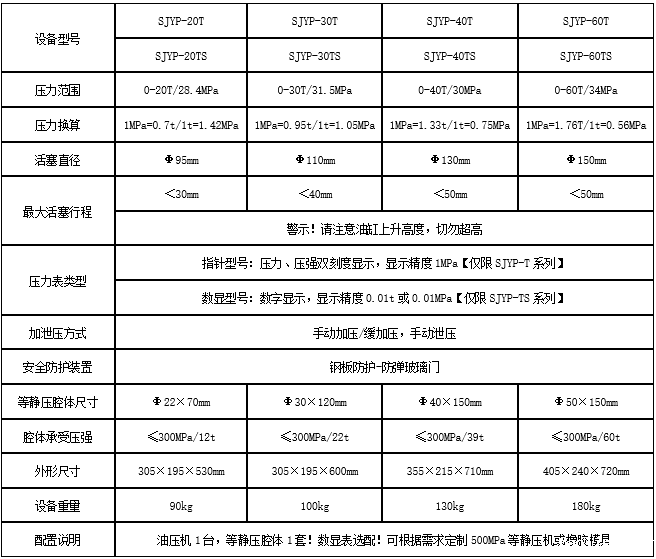 SJYP-T/S系列采用手动液压驱动,是新诺等静压系列中的入门机型,因其经济性,每次制样取样均需要搬动等静压腔体,适合制样少,对工作效率要求不高,有力气且安全意识较高的男生操作使用。一机多用,取下等静压腔体也可作为普通压片机使用,可根据客户需求选配不同模具。